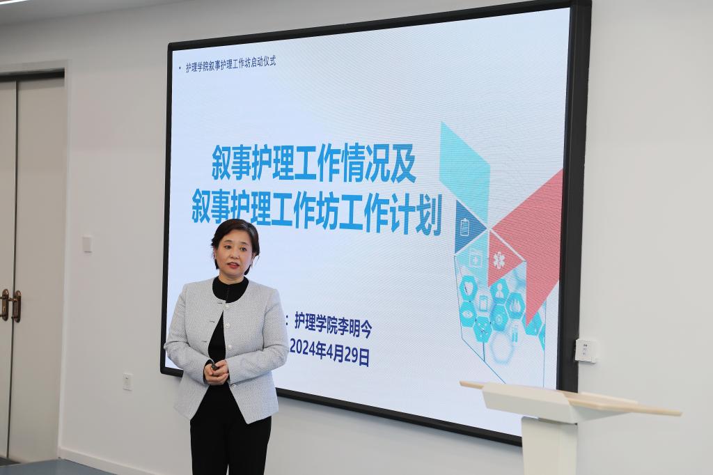 郭艳春致辞,她强调启动“天使之翼”叙事护理工作坊是延大护理人叙事研究与实践的重要平台,是对国家战略和新医科发展趋势的积极响应,并祝愿护理学院在教学与科研上取得新突破,为学校的教育教学创新和高素质人才培养贡献人文力量和智慧。杨晓霖做线上致辞,祝愿护理学院在叙事护理的研究与实践方面取得更大成就。