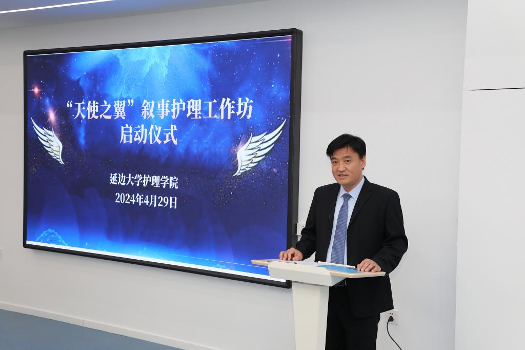 4月29日下午15:00时,护理学院举行了“天使之翼”叙事护理工作坊启动仪式。延边大学教务处副处长郭艳春、延边大学附属医院儿科教研室主任金贞爱、延边大学附属医院急危重症护理单元护士长王艳菊及其团队、南方医科大学中国生命健康叙事分享中心创始人杨晓霖教授(线上)出席仪式,副院长金润浩主持仪式。