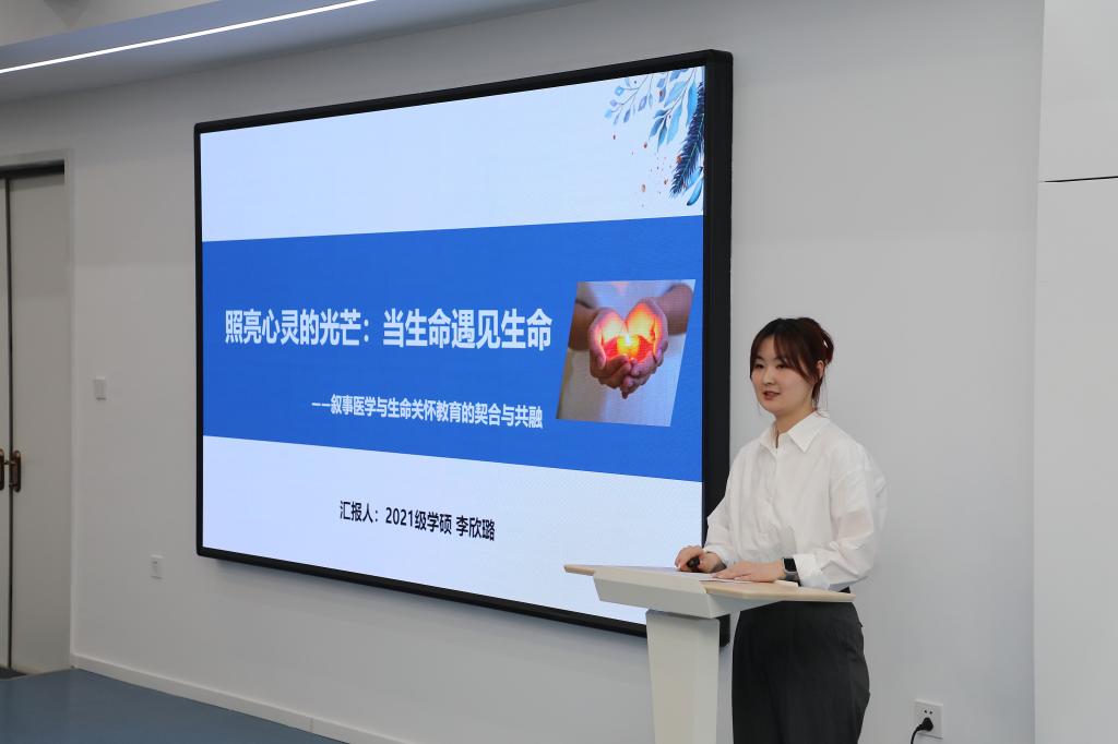 金贞爱分享“儿童青少年健康与家庭叙事生态”实践体验;王艳菊及团队成员展示了附属医院重症医学科“医护一体化模式下临时家属项目”开展成果;研究生李欣璐和赵婧贻分别汇报叙事护理论文成果;天使之翼”叙事护理工作坊负责人李明今全面回顾学院叙事护理研究与实践取得的阶段性成果,并在团队建设、平台建设、课程建设、教科研建设及叙事护理实践等方面提出了设想。