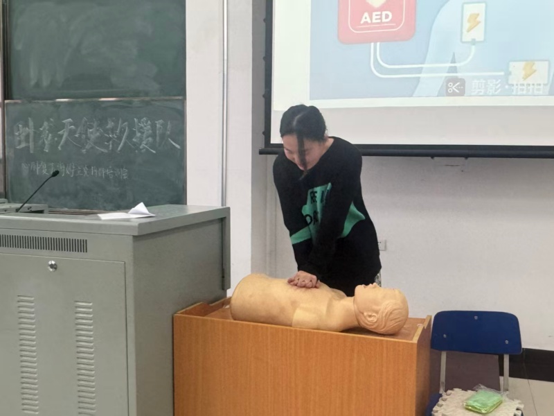 活动伊始,队员细致讲解了心肺复苏的适用场景、操作步骤、动作要领及相关注意事项,着重强调“黄金四分钟”是抢救生命的关键时段。随后,队员借助人体模型开展心肺复苏现场实操演示,将意识判断、胸外按压、开放气道、人工呼吸等核心步骤逐一拆解示范。接着,队员系统讲解了海姆立克急救法的原理、气道异物梗阻的识别要点,并现场完整演示了操作步骤。最后,同学们主动分组展开实操练习,模拟演练急救操作,在实践中巩固所学急救技能。