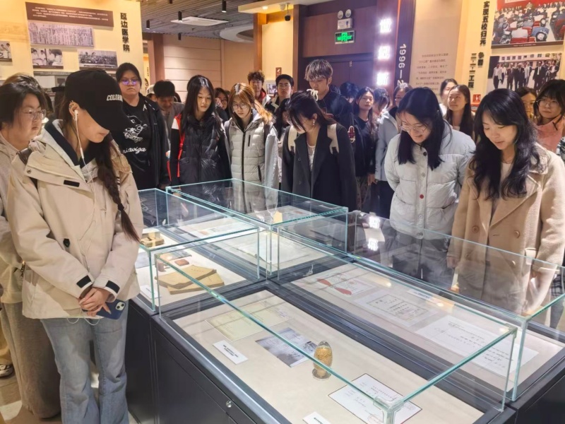 活动伊始,校史馆讲解员为同学们系统介绍了场馆建设背景与展览核心脉络,带领大家开启校史学习之旅。随后,讲解员引导同学们通过老照片、文献资料、老旧教学仪器等珍贵展品,全面了解学校建校77年来的发展历程,以及学科建设、师资队伍、人才培养等方面的丰硕成果,重点学习了学校医学、护理学科的突破成就,以及护理前辈扎根边疆、践行医者使命的先进事迹。最后,同学们深入领会了“求真、至善、融合”的延大精神,在参观过程中不时驻足交流、主动提问探讨,现场学习氛围浓厚。